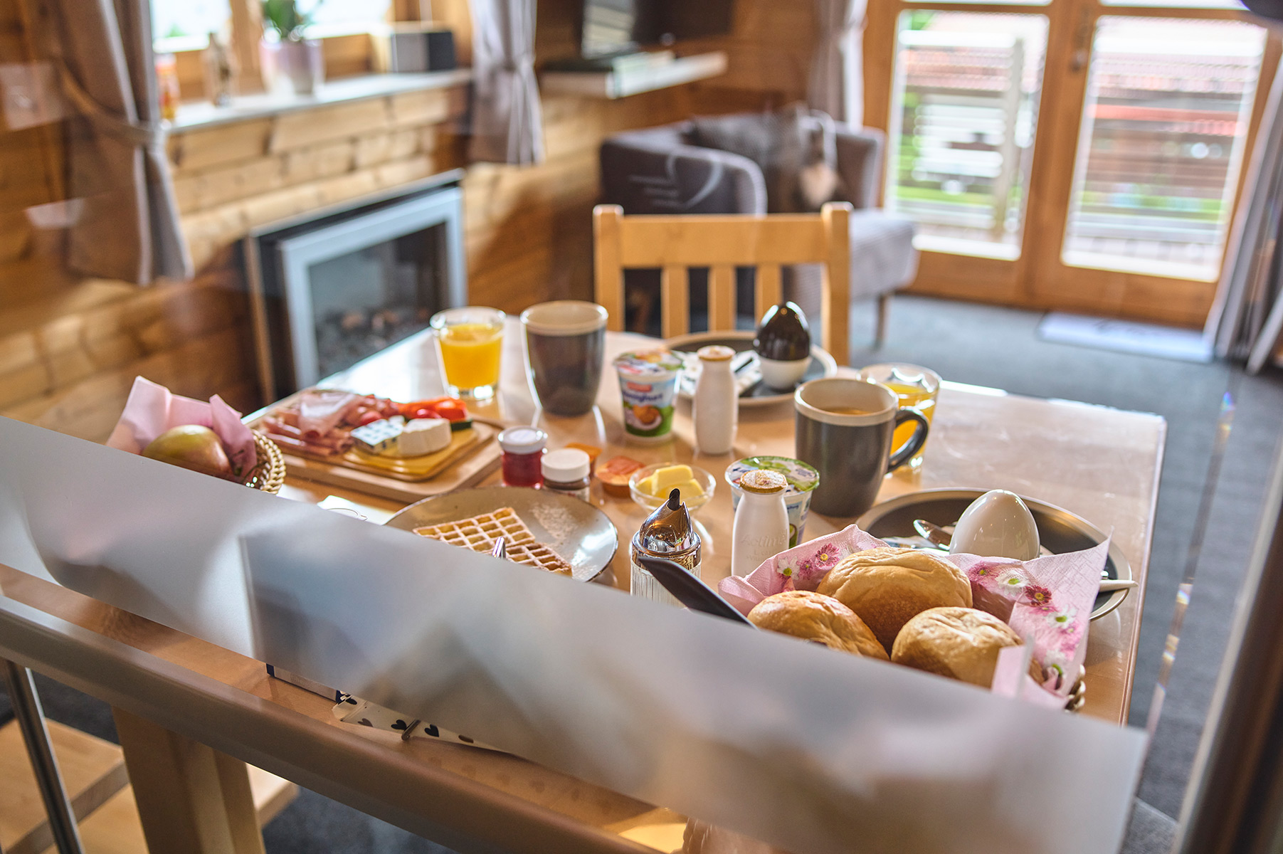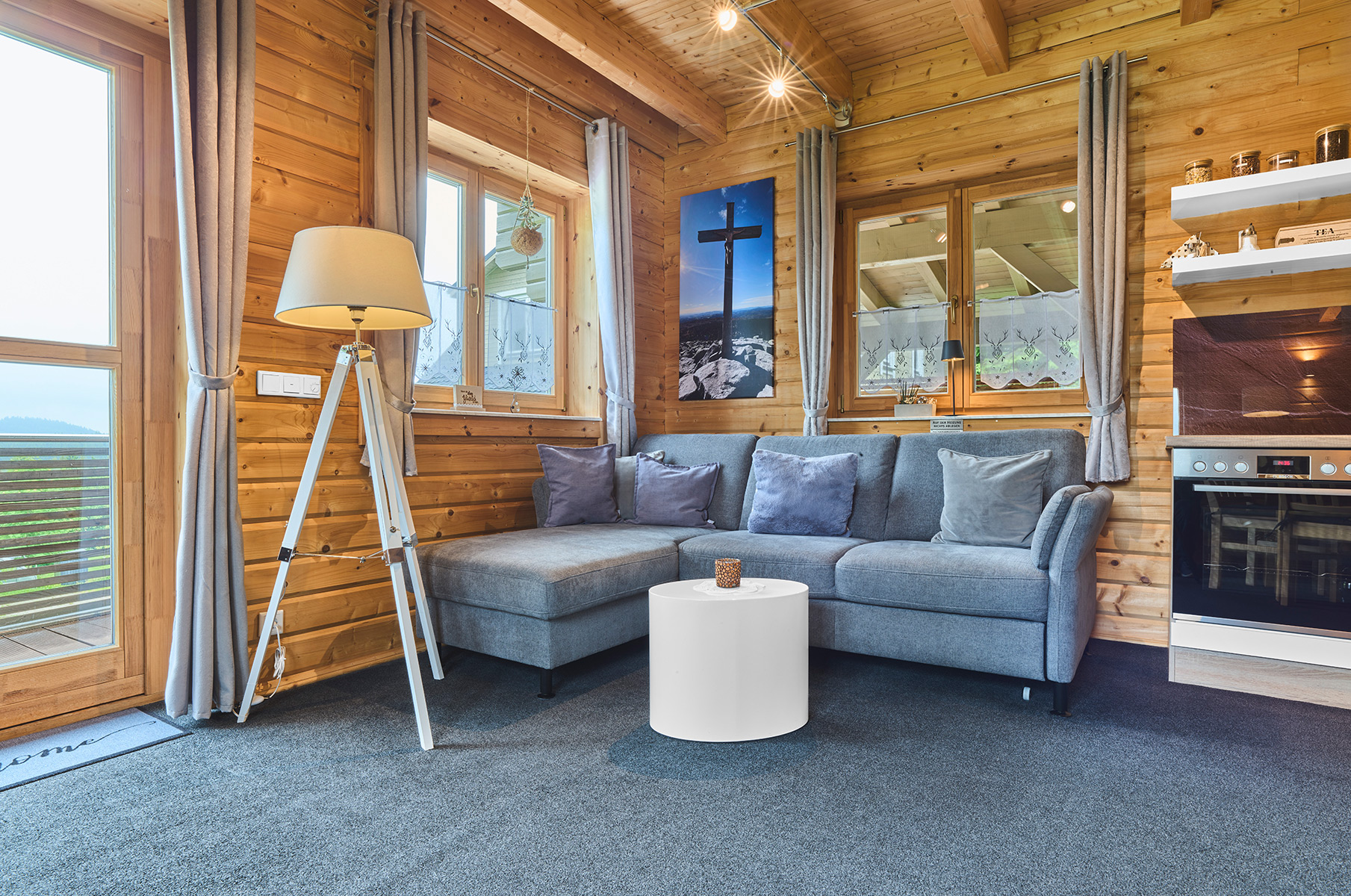 Unsere beiden Chalets sind bewusst klein gehalten, um Großzügigkeit zu schaffen: viel Licht, klare Linien, natürliche Materialien und liebevolle Details. Im Obergeschoss erwartet Sie ein helles Schlafzimmer mit Balkon und wunderbarem Fernblick über die Wälder bis ins österreichische Mühlviertel, im Erdgeschoss ein gemütlicher Wohnbereich, der den Blick nach draußen öffnet.